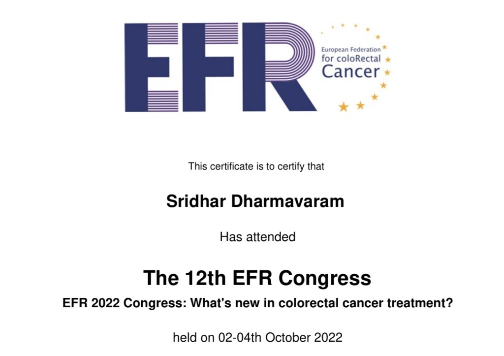 EFR Colorectal Cancer Congress Posted bySridhar Dharmavaram30th Jan 202330th Jan 2023Posted inConferences What’s new in Colorectal Cancer treatment? 12 th European federation for Colorectal cancer Share this: Click to share on X (Opens in new window) X Click to share on Facebook (Opens in new window) Facebook Like Loading... Related Published by Sridhar Dharmavaram Consultant Gastrointestinal Surgeon View more posts